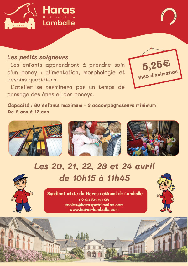 L’été le Haras propose des mini-camps. Plusieurs ateliers sont possibles en fonction de l’âge des enfants : jeu de piste, démonstration équestre, balade en calèche, petit soigneur…