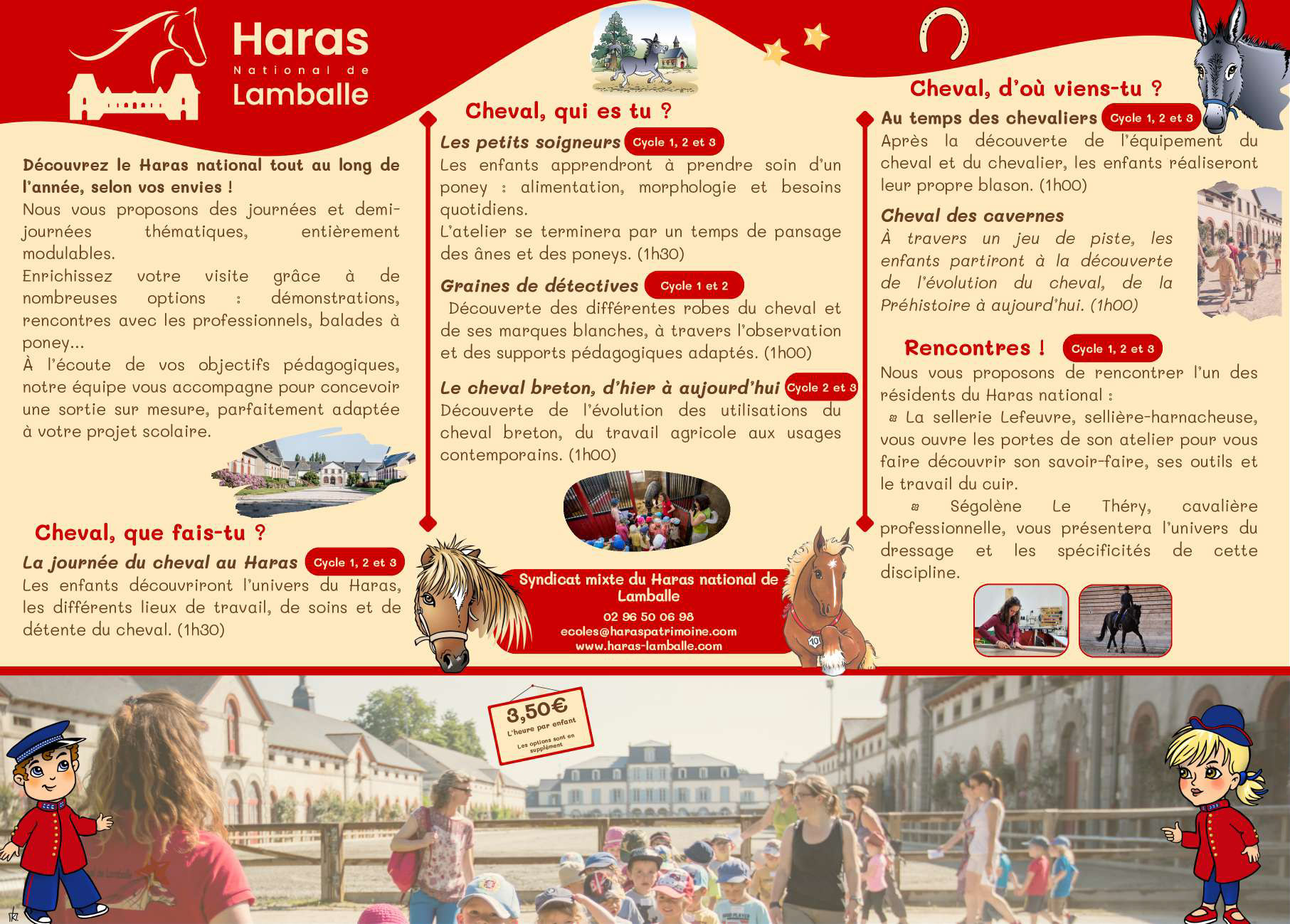 Visite à thème, journée organisée, démonstration équestre, rencontre avec des professionnels, ateliers autour du cheval (pansage, morphologie, robes, métiers...), visite guidée...